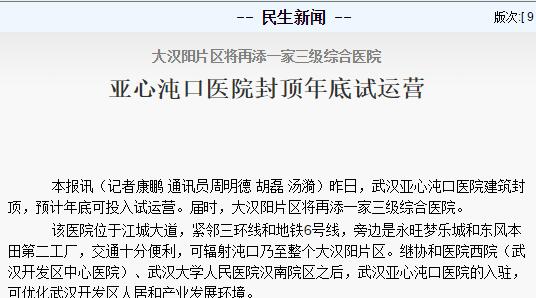 大漢陽片區(qū)將再添一家三級綜合醫(yī)院,亞心沌口醫(yī)院封頂年底試運營!(載《長江日報》2017年3月27日第九版) 鏈接:http://cjrb.cjn.cn/html/2017-03/27/content_5601713.htm?from=groupme